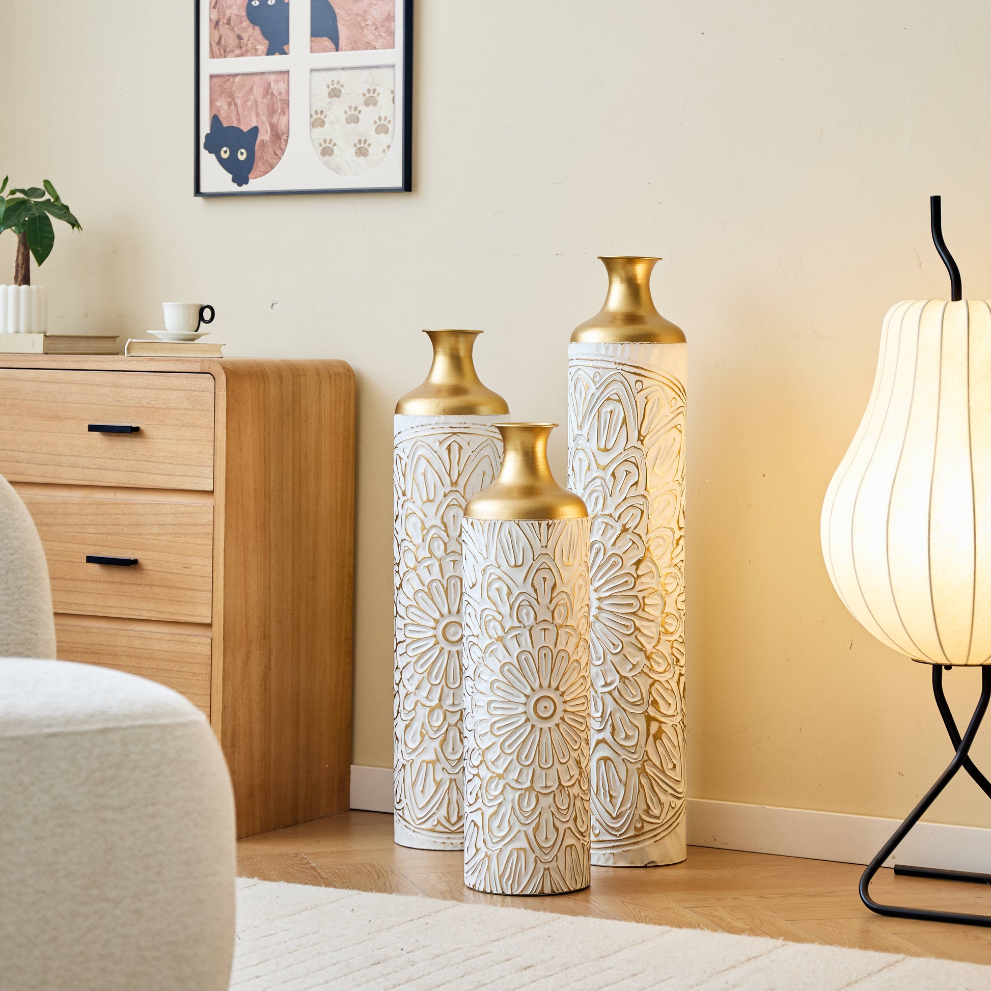 Modern Elegance Meets Glam Style -- Bring a sophisticated edge to your interior with this stunning set of metal vases. Featuring a clean white textured finish and accented with a blend of polished and hammered gold, these vases offer a unique balance of minimalism and glam. The all-metal construction ensures long-lasting durability while making a bold visual impact. Perfect as a standalone statement or paired with faux stems, these vases enhance any space from living rooms to office shelves with a luxe, contemporary flair. Their tall silhouette and sleek design make them versatile décor pieces that suit a range of home styles.