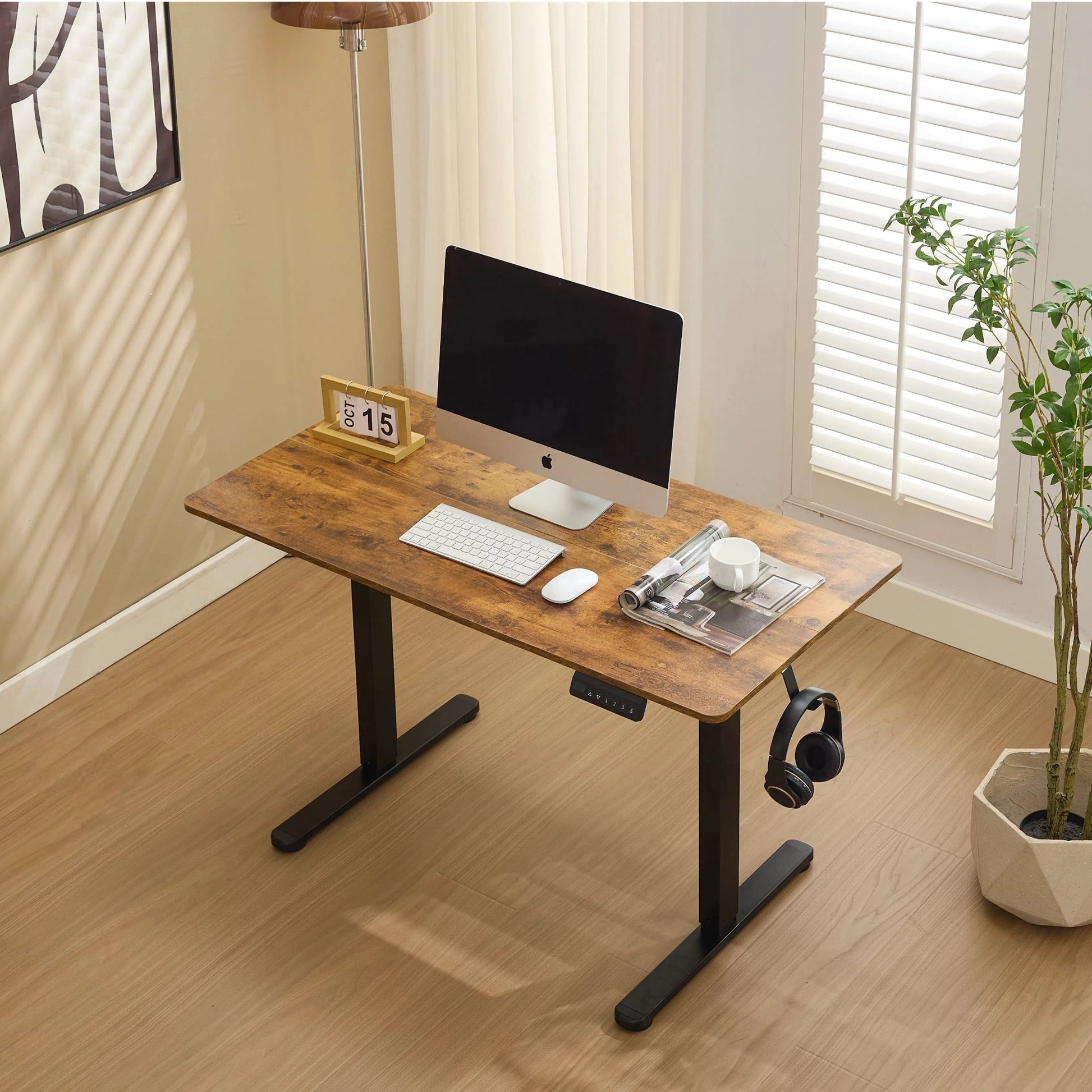 This computer desk lets you easily switch between sitting and standing. It has an adjustable height design, allowing you to customize it to meet your changing needs and stretch your legs all day. Made of engineered wood with a neutral surface, it sits on a stainless - steel T - shaped base. With a programmable memory controller, you can reach the perfect height every time.