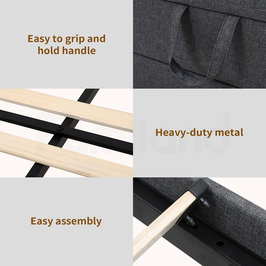 Designed with space-saving storage in mind, the bedframe queen-size includes a built-in drawer with smooth-gliding casters, offering ample storage for clothing, toys, or essentials. This feature keeps your room organized and clutter-free while keeping items easily accessible.