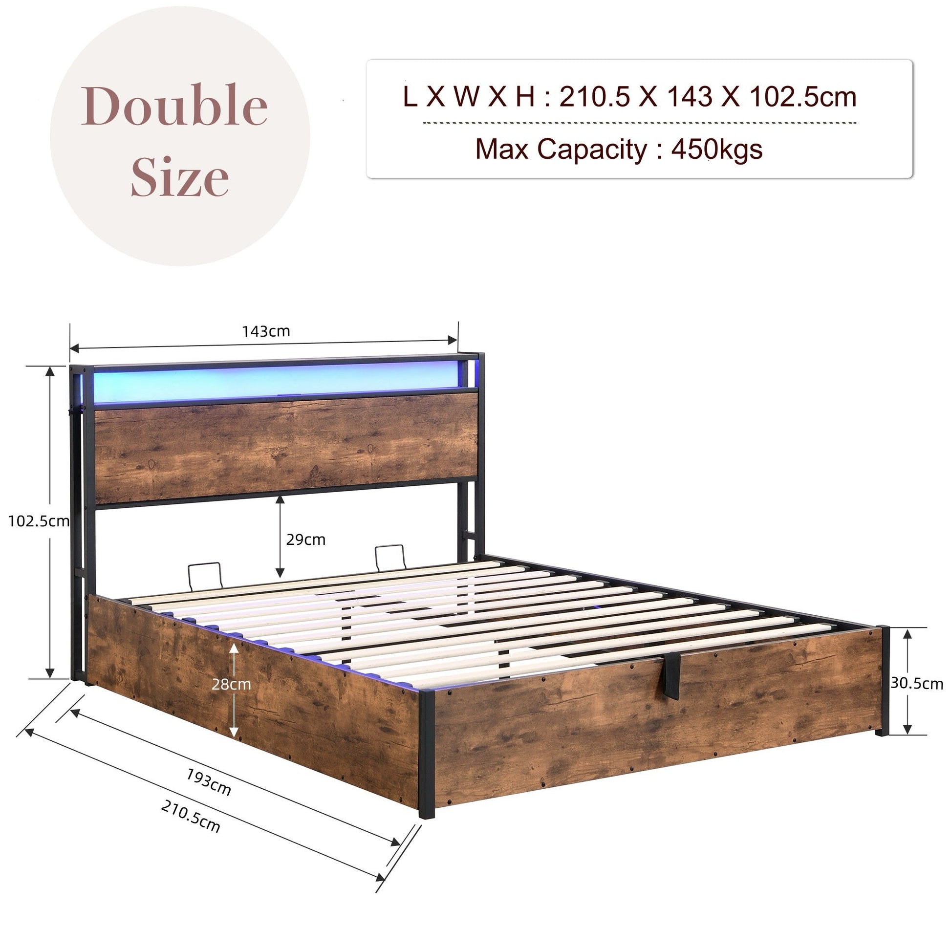-- Storage Headboard with Charging Station: The lift up storage bed frame Double size comes with a two-tier wooden storage headboard that provides a convenient place to keep cell phones, headphones, alarm clocks, and other essentials within easy reach.Plus, with 1 Type-C and 3 USB ports built into the headboard, charging your phone, tablet, or other electronic devices has never been easier, allowing you to unwind and relax without worrying about battery life.
