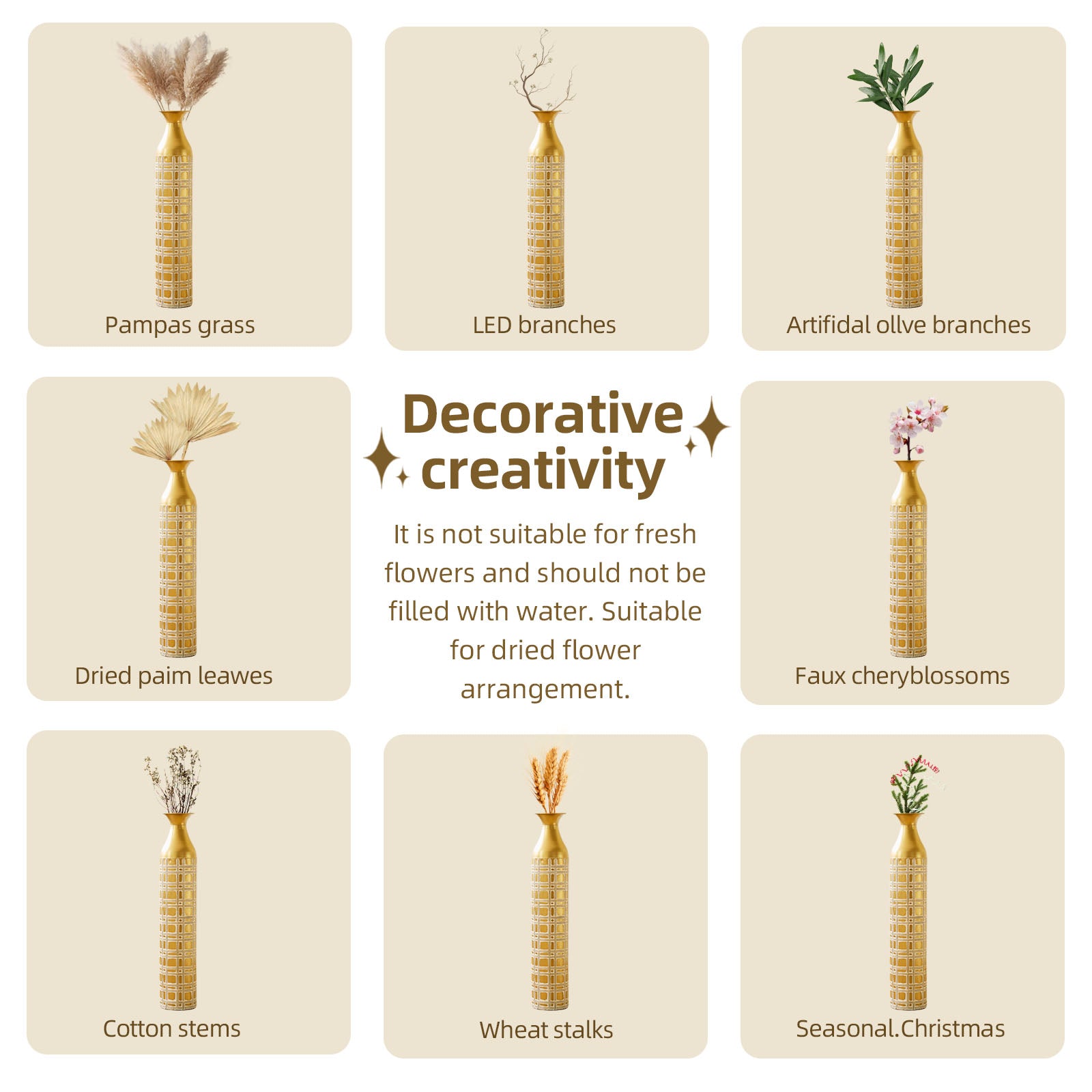 Versatile Styling Essential: Perfect for creating stunning displays year-round. Showcase a lavish bouquet of fresh flowers, elegant dried branches, or minimalist faux foliage. Its neutral colour palette with gold accents allows it to blend seamlessly with your existing decor.