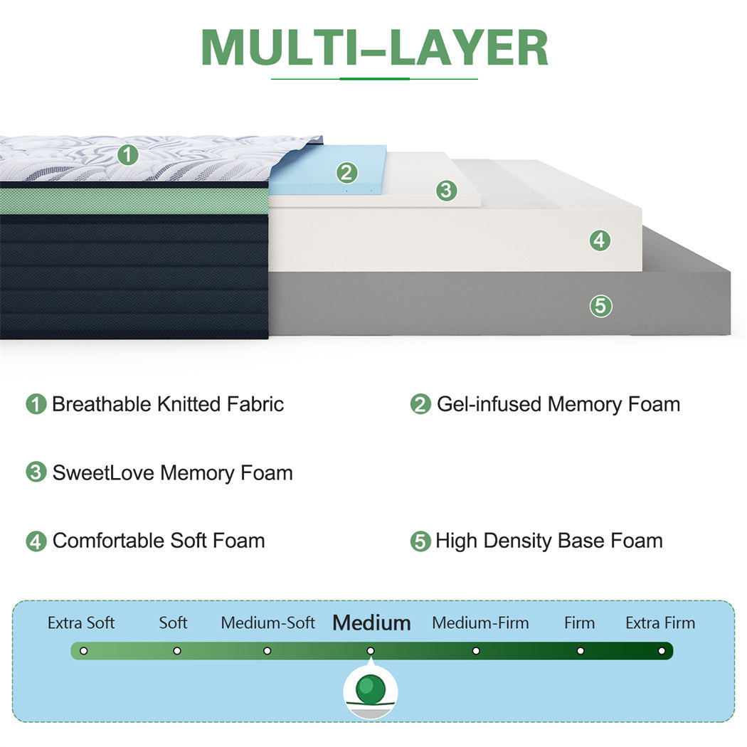 Its combination of four different foam layers ensures cooling comfort, contouring pressure relief and core support with every sleep.The top layer comprise a cool gel memory foam that dissipates your body heat while you sleep while the middle two comfortable Memory Foam layers and bottom high-density supportive foam layer work together to provide total body support with pressure relief at all your vital points.