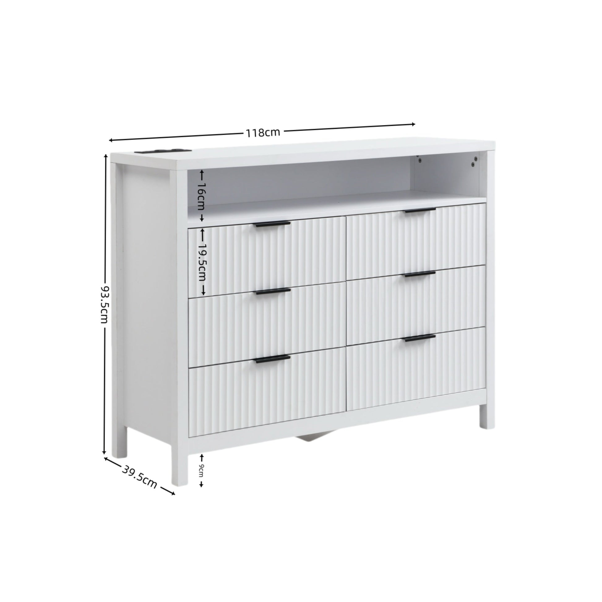 White Dresser for Bedroom with 6 Drawers, Power Outlet and LED Lights